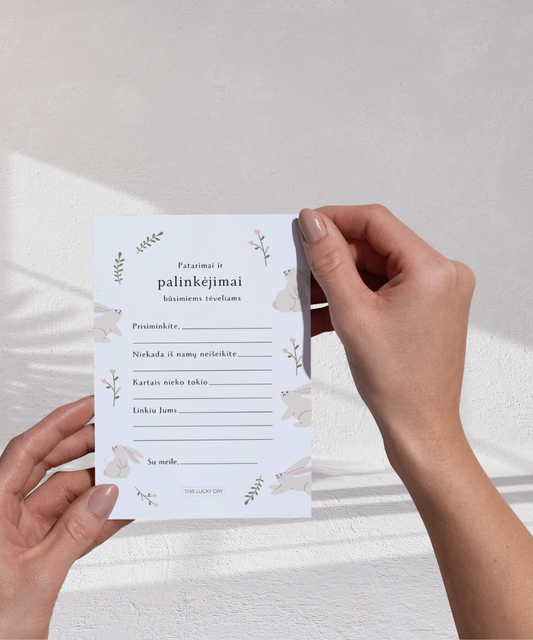 Patarimų ir palinkėjimų kortelės kūdikio sutiktuvių (Baby Shower) šventei su zuikučiais