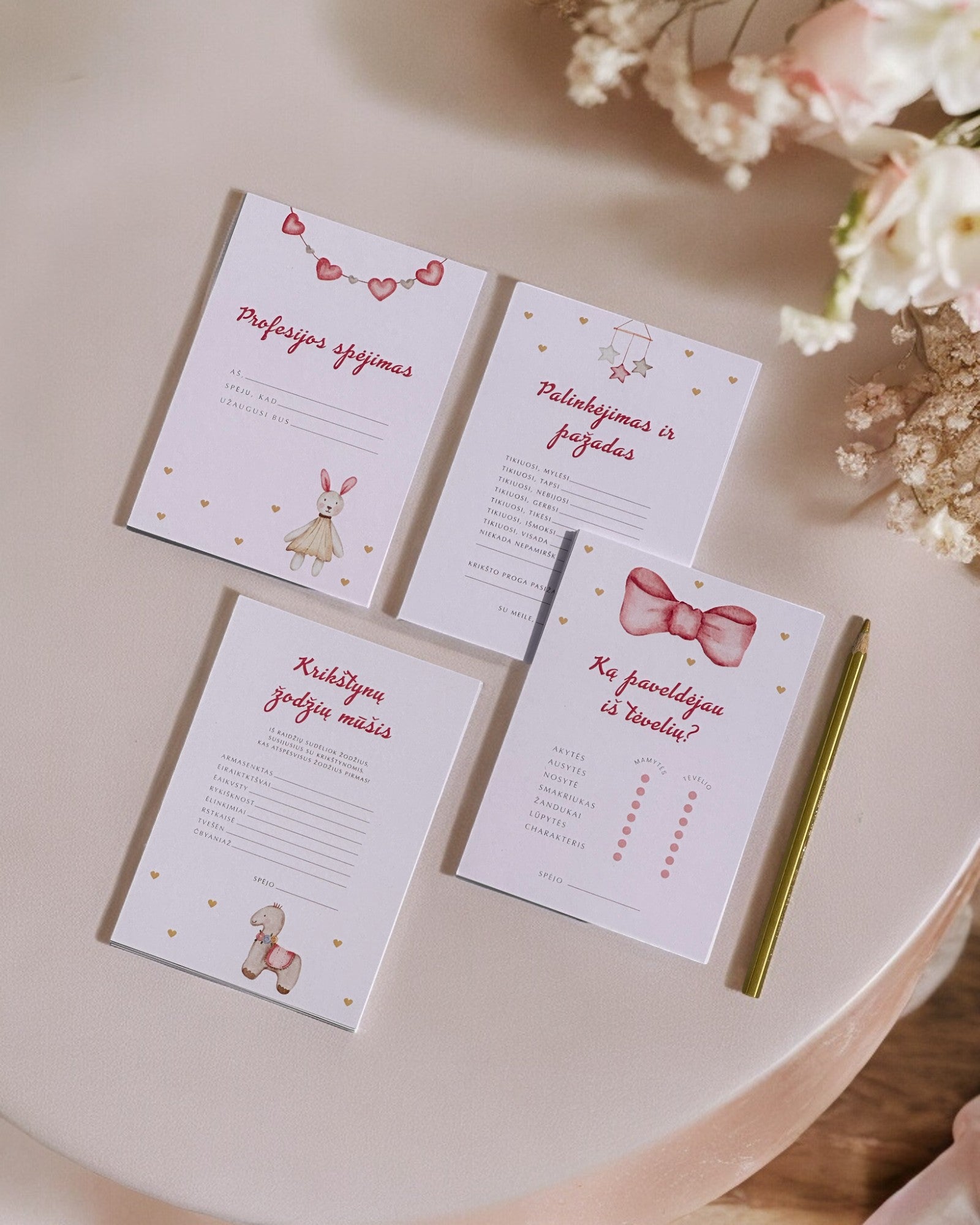 Keturi populiariausi žaidimai krikštynų šventės metu, nugulę ant šviesiai rausvų, švelnios pastelinės spalvos kortelių, kurie suburs visus dalyvius į bendrą veiklą! O artimųjų spėjimų ir palinkėjimų užrašai liks šiltu prisiminimu krikštukės šeimai.