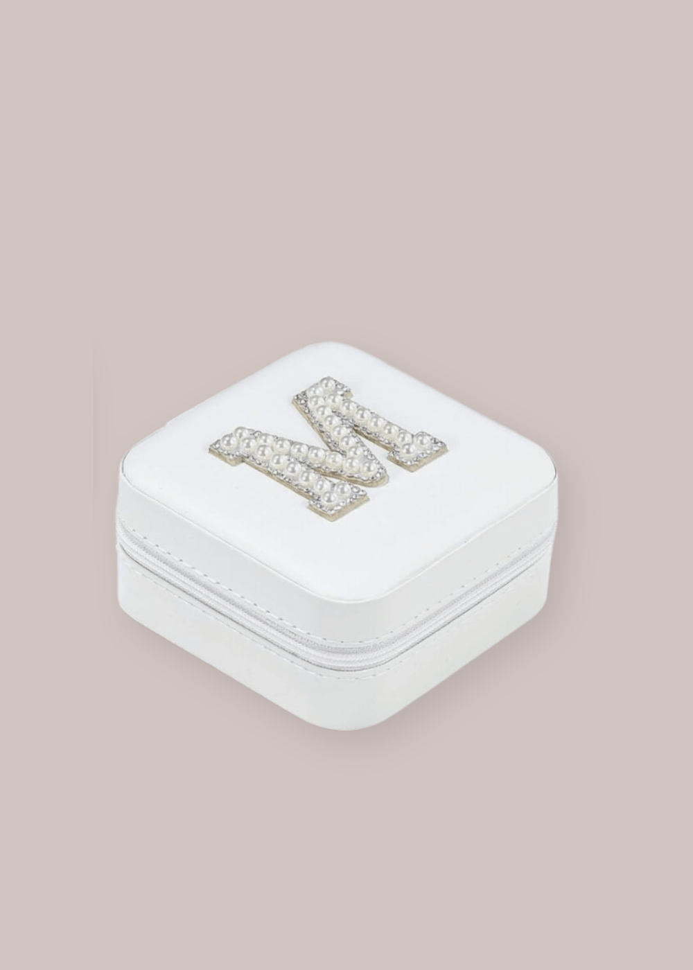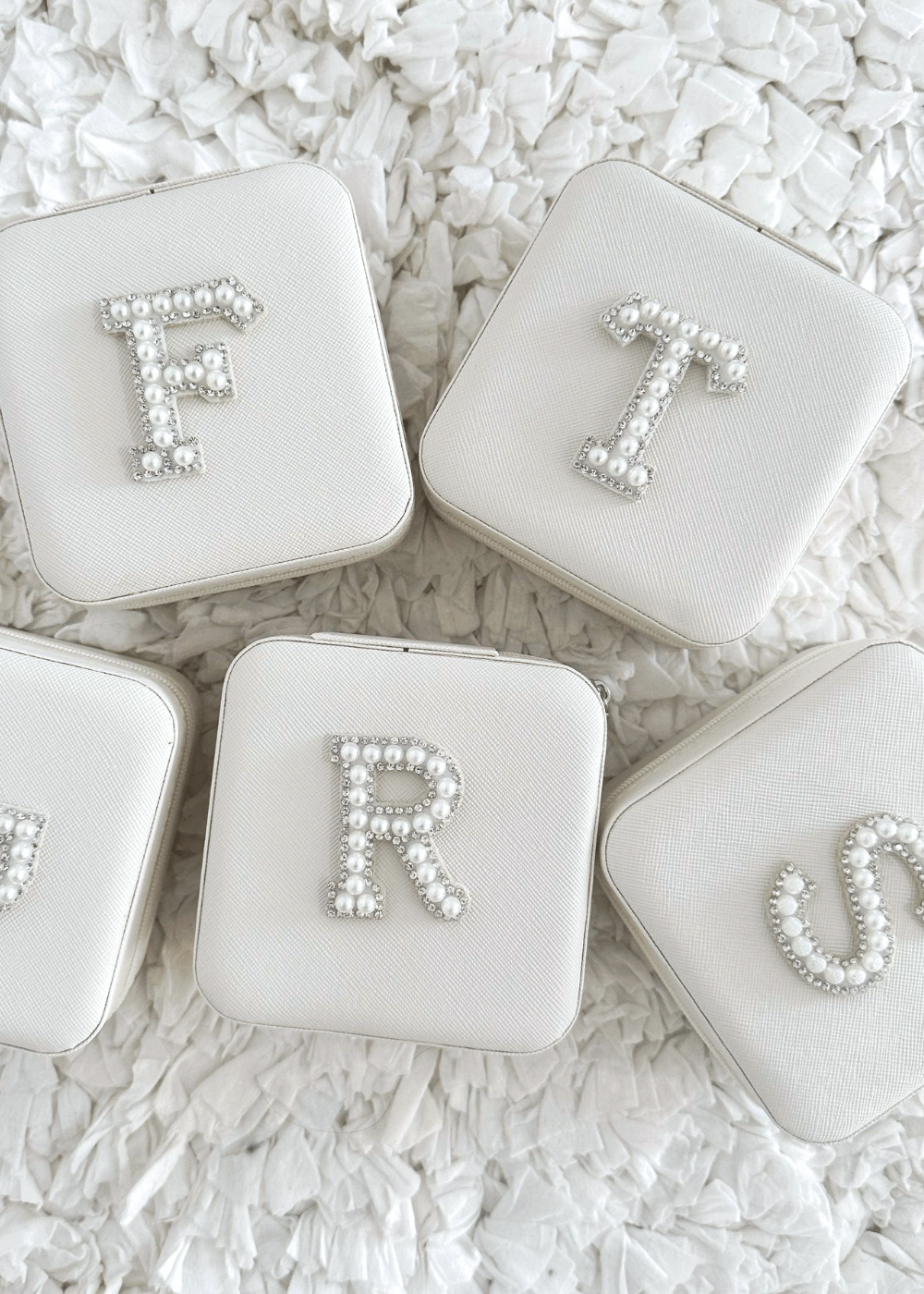 Ši kelioninė aksesuarų dėžutė su pasirinkta, personalizuota vardo raide yra elegantiška ir praktiška dovana nuotakai arba pamergėms, mergvakario dalyvėms.